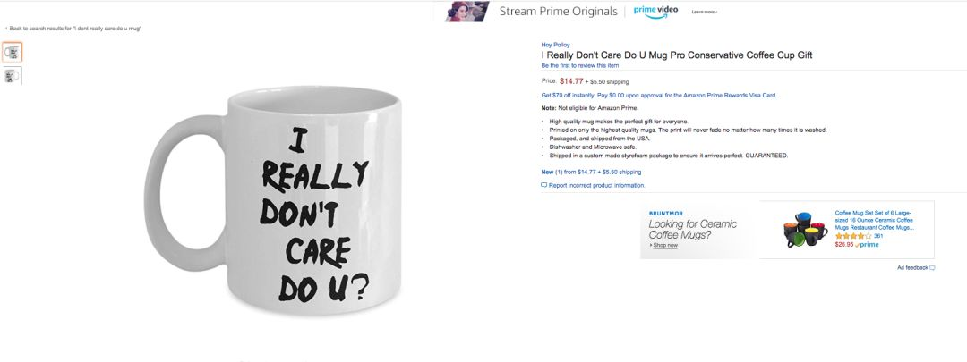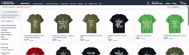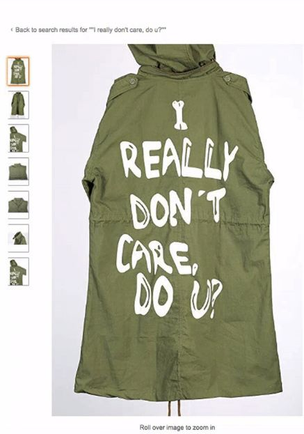 在亚马逊网站上搜索“Idon't really care do u”,结果可以搜到超过900个相关的产品,其中很多都印有这个短语。