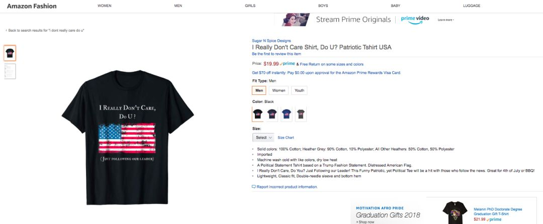 另一家亚马逊商店的名字直接被取为了“idon't care do you”,并在店内出售一系列印有这句话的的T恤和连帽衫。