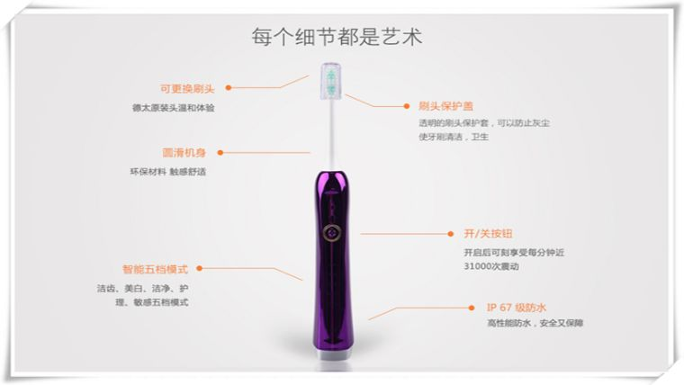 这款电动牙刷采用环保材料,入口触感舒适,可更换刷头,带刷头保护盖,IP67级防水。在设计上分为洁齿、美白、洁净、护理、敏感等智能五档模式,并有超长使用时间,采用无线感应式充电,拿起即用,放下即充。每次充电9小时左右,大概使用20天左右。
