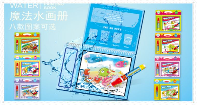 神奇水画系列产品由可爱的卡通图案和丰富的色彩构成,孩子们可以在水画布上自由地绘画涂鸦,描字写字,不仅激发孩子们的想象力和创造力,同时能培养孩子们的环保意识。