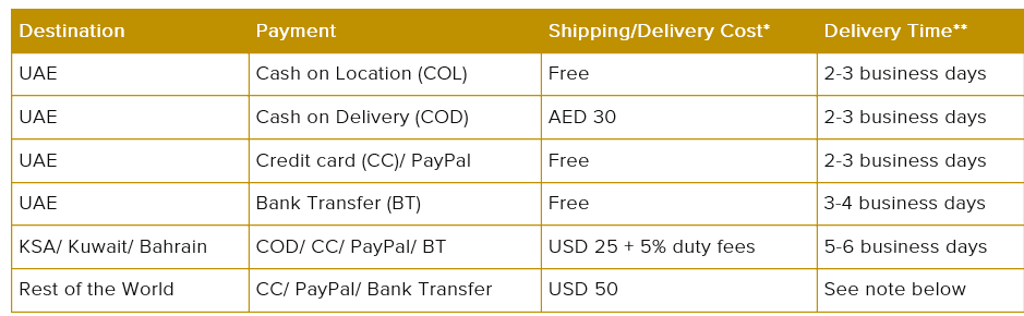 沙特、科威特和巴林的消费者直接网上支付的话需要额外缴纳5%的关税,订单低于1000美元时,运费为25美元。货到付款的费用则取决于具体的配送地址,高级的主表和贵金属手表也不适用该服务。
