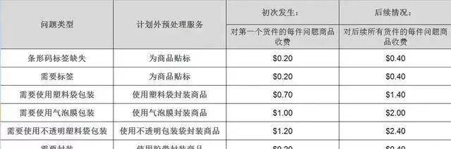 5、计划外服务费:若遇突发情况,需要亚马逊代为处理的,则需要收取相应的额外服务费。(譬如:你寄到亚马逊仓库的商品没有经过妥善的预处理或贴标等)按件收取,第一个货件享半折优惠。