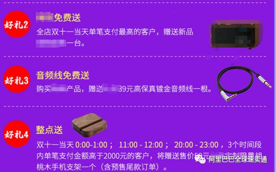 4. 丰富店铺的活动玩法。以大额无门槛优惠券、二维码定向优惠券、限时满减、满送等方式,制造“限时秒杀”、前1小时超低价入手等极具噱头的店铺活动,为双11进行蓄水。