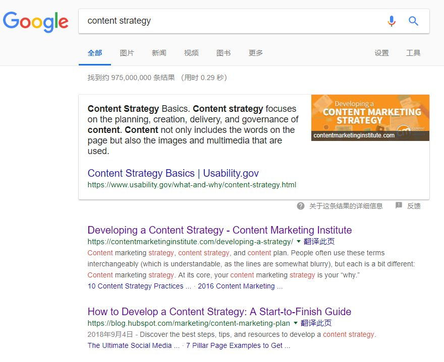 有很多关键词在Google搜索第一页是没有视频结果的,比如“content strategy”