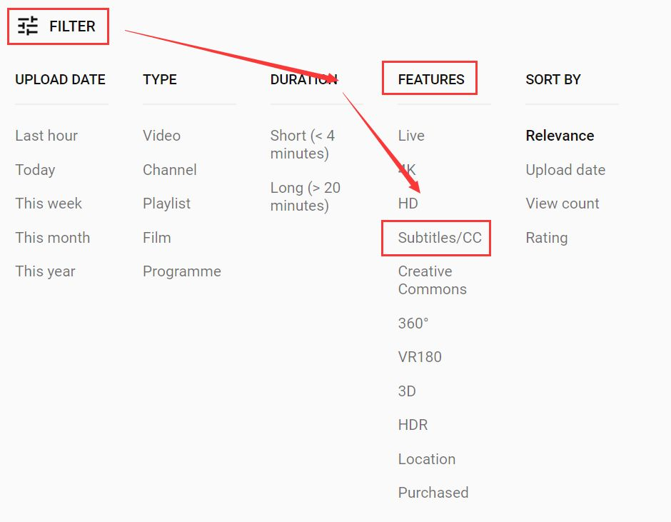 我们可以搜一下有字幕的视频,选择“种类:字幕”,可以在YouTube搜索框直接搜索,也可以自己选择板块。