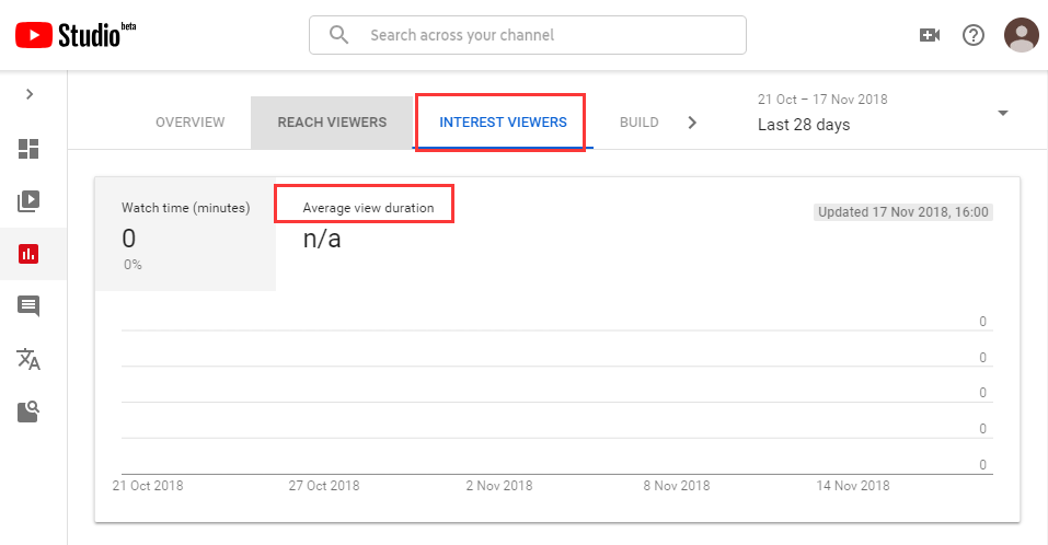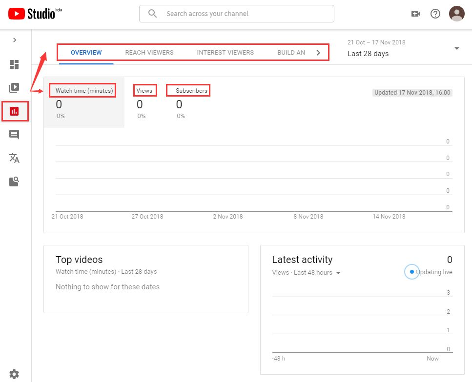 我们可以查看这些数据,在我们YouTube账户的分析那里:因为我还没有发过视频,所以这里数据都是空的。