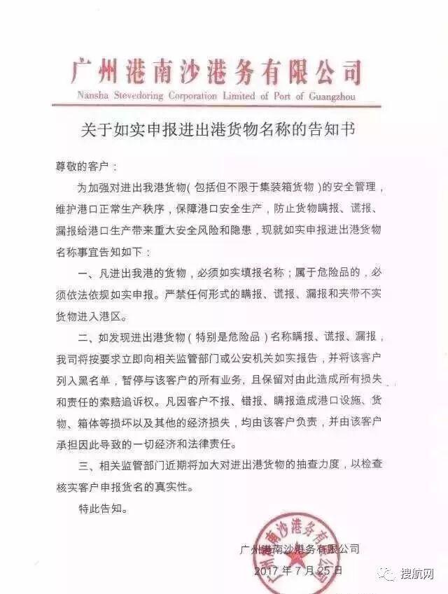 在事故发生后,广州南沙港在7月25日发布公告称,将严查进出港的货物,凡是进出港的货物必须如实填报名称,属于危险品的必须依法依规如实申报,如发现客户因谎报、瞒报、漏报造成损失的,将由改客户承担所有经济和法律责任,将客户加入黑名单并暂停与其所有业务。