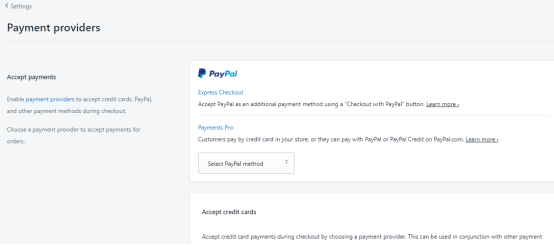 Accept payment这里有四种收款方式供选择:PayPal、Accept credit cards、Alternative payments、Manual payments。