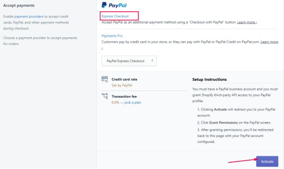 选择“Express checkout”,然后点击“Activate”,绑定Paypal账号。
