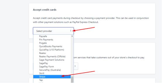 在“Accept credit cards(信用卡设置)”部分,点击“Select provider(选择方式)”中的“Stripe”就行了,如下图所示: