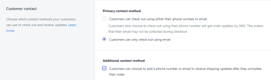 “Customer contact(客户联系方式)”是选择客户在下单时的联系方式,邮箱or电话,或者只有邮箱。