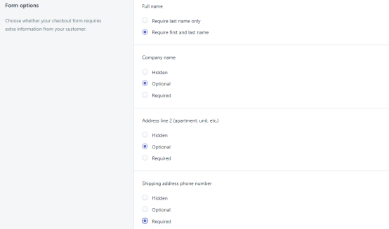 “Form options(信息选项)”是设置哪些信息是客户下单时必填的,第一个“Full name(全名)”