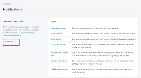 点击“Notifications(通知)”,进入通知设置界面。在通知设置界面上显示“Orders(订单信息)”,“Shipping(物流信息)”,“Customer(客户信息)”等.