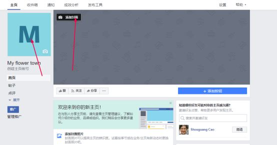 另外,你的logo和图标还可以用作Facebook或Instragram的头像。例如,我在Facebook上面设置头像和封面,点击“上传图片”和“添加封面”: