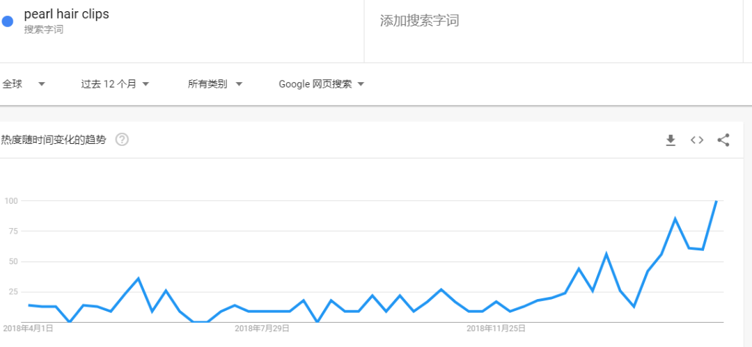 根据谷歌趋势显示,从去年年底珍珠发夹的搜索热度开始迅速飙升,到今年春节这类产品依然有热搜的趋势。