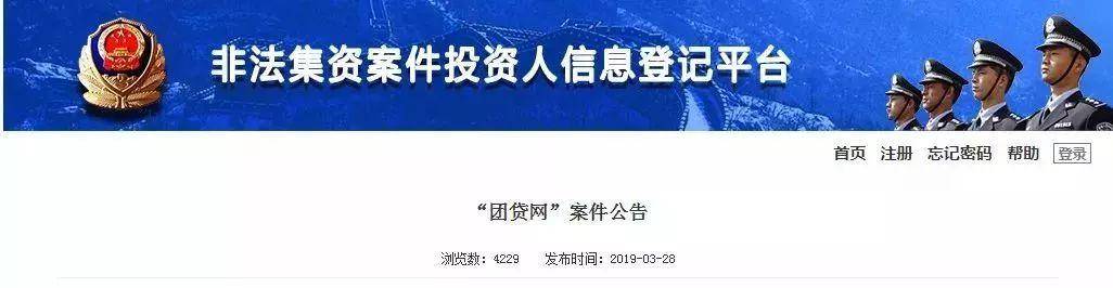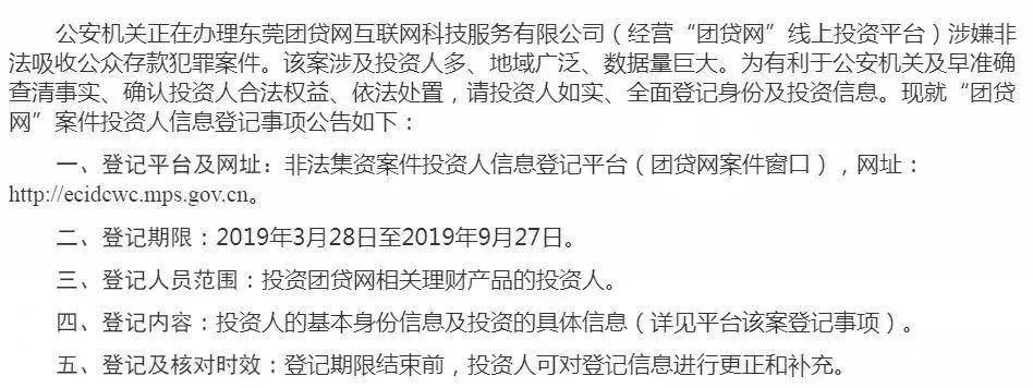 公安部非法集资案件登记平台已开通“团贷网案件窗口”,登记期限显示为2019年3月28日至2019年9月27日。