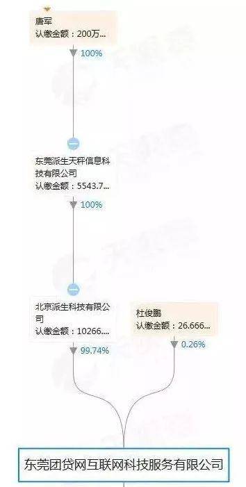 天眼查数据显示,东莞团贷网互联网科技服务有限公司成立于2016年2月,注册资本1.0293亿人民币,实缴资本7693.333万人民币,公司法人、执行董事及实控人均为唐军。大股东为北京派生科技有限公司,股权穿透后的实控人为唐军。