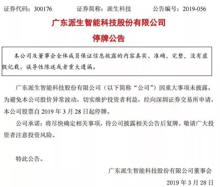 3月28日,上市公司派生科技紧急停牌,因重大事项未披露,为避免本公司股价异常波动,切实维护投资者利益,经向深圳证券交易所申请,本公司股票自2019年3月28日起停牌。