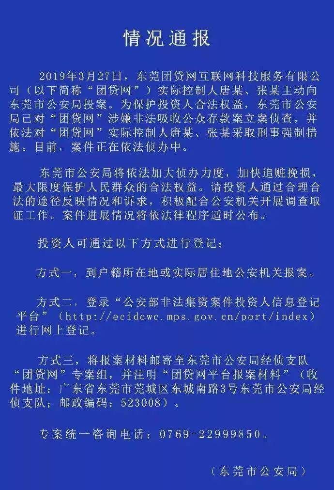 通报称,2019年3月27日,东莞团贷网互联网科技服务有限公司实际控制人唐某、张某主动向东莞市公安局投案。为保护投资人合法权益,东莞市公安局对“团贷网”涉嫌非法吸收公众存款案立案侦査,并依法对“团贷网”实际控制人唐某(唐军)、张某(张林)采取刑事强制措施。