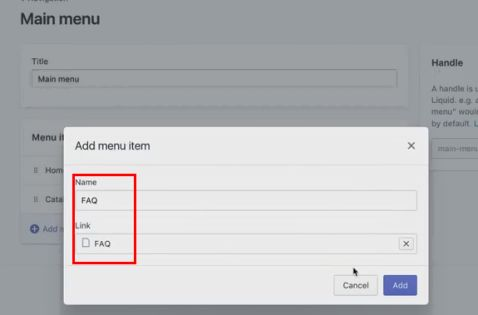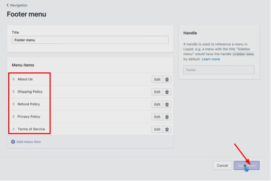 所有的页面都添加好之后,就来设置“navigation(导航)”,点击“Online store”里面的“navigation”,有两个部分“主菜单(main menu)”和“页脚菜单(Footer menu)”。