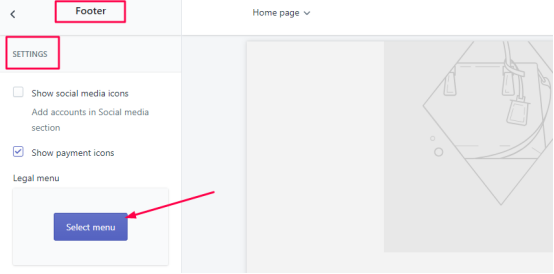再来设置“页脚(Footer)”部分,点击“Footer”中“设置(Settings)”下的“选择菜单(Select menu)”,选择“页脚菜单(Footer Menu)”,然后保存: