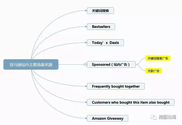 做亚马逊,除了要优化好站内的listing,我们还希望亚马逊给我们尽可能大的流量。亚马逊的主要流量入口如下图: