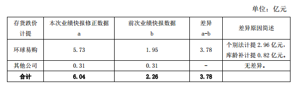 二是受流动性趋紧影响,在外部银行融资政策收紧下,环球易购在 2018 年三季度和四季度受到银行放款放缓影响较为明显,2018 年银行渠道融资减少约 7 至 8 亿元,使得环球易购在四季度销售旺季未能如预期进行广告投入和促销推广,部分历史存货错过了销售的最佳时机。环球易购将部分一年以上存货通过个别法全额计提存货跌价准备,一方面更充分、公允反映了 2018 年末时点的环球易购资产状况,使其财务信息更加可靠,有利于投资者了解经 营情况;另一方面,环球易购结合外部经济形势变化趋势,及时将战略重点从规模扩张转变为盈利能力及盈利质量的夯实,更注重现金回流能力及存货周转率,聚焦盈利能力及盈利质量的提升。本次计提存货跌价准备不涉及会计政策或会计估计的变更,系环球易购根据产品品类属性、产品存储区域、公司销售经营策略等情况确定的存货跌价准备计提。截至本公告发布之 日,结合环球易购期后实际情况,2018 年末存货跌价准备已经充分计提,库存减值风险得 到如实反映。