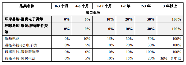 跨境通方面表示,经与同行业相比,环球易购与同行业均按存货的成本与可变现净值孰低提取或调整存货 跌价准备;具体而言,环球易购根据产品品类属性和其市场价格的波动情况确定了不同种类存货需计提跌价准备的库龄层次,根据库龄计提存货跌价的具体政策与同行业基本保持一 致,存货跌价计提充分,具备合理性。