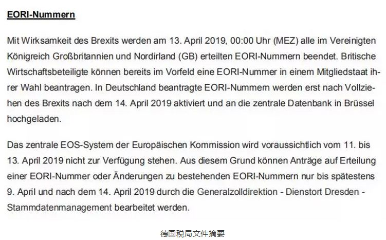 据J&P注册会计事务所爆料,近日德国税局发布一份重要通知文件,通知里面显示:2019年4月13日,英国的EORI号将可能无法在德国以及欧盟地区清关。