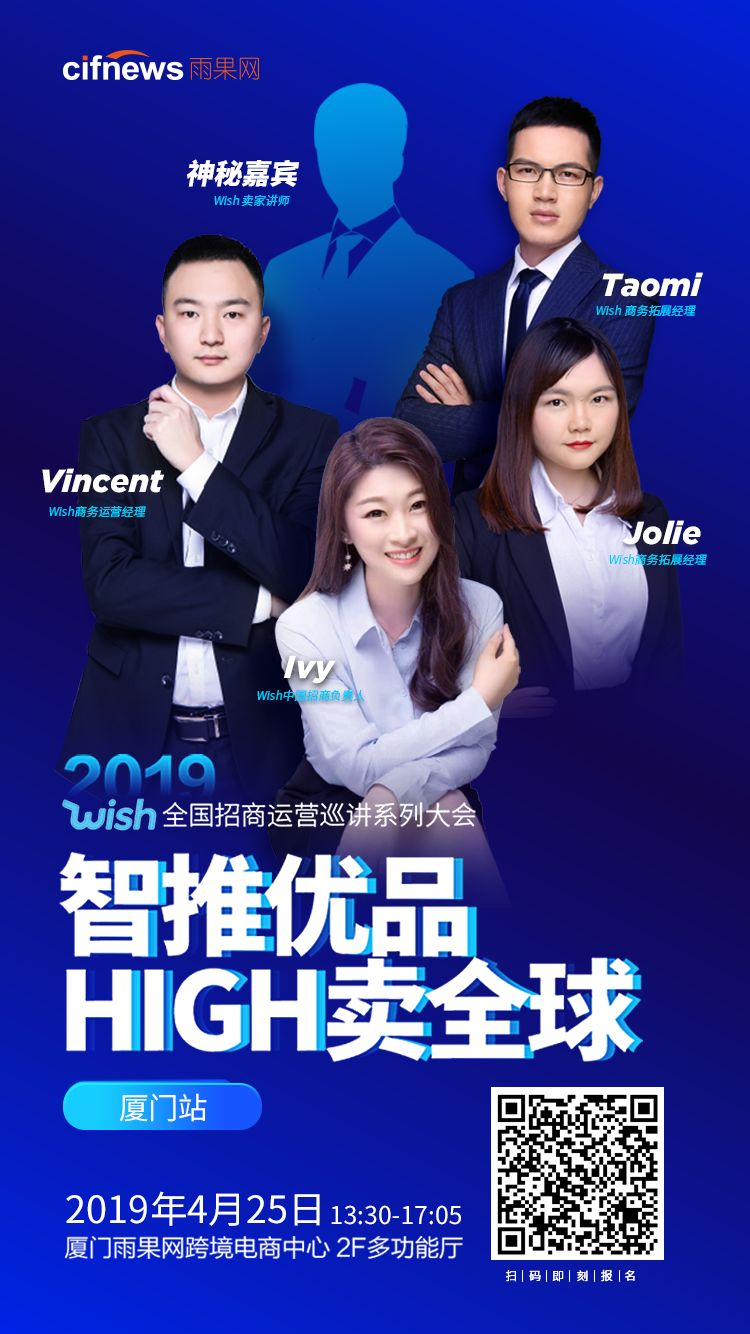 Wish招商团队坐镇,平台数据揭秘、物流体系升级、2019平台政策指南、新商户福利,尽在wish全国招商运营巡讲系列大会——厦门站,活动报名请点击阅读原文