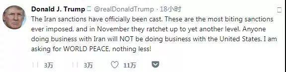 所以,大家要注意了,要谨慎行事。此外,从川普的推特消息也能看出来,对伊朗的制裁态度是非常坚决的,制裁一直在不断加剧,直接压迫到伊朗业务: