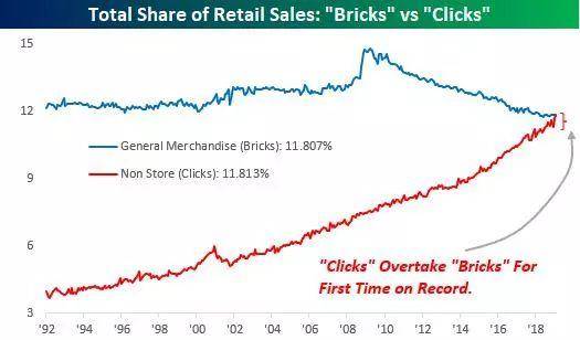 在过去的20年里,被称为“clicks”的电商行业不断侵蚀传统行业的市场份额。根据美国商·务·部的数据,20世纪90年代末,电商行业的市场份额不到5%,而2019年上升到12%左右。
