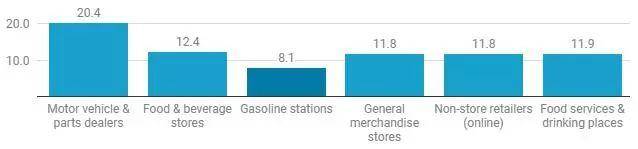 上图是2月份各行业调整后零售总额所占百分比。