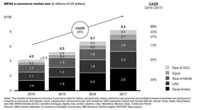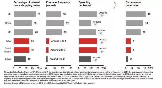 谷歌和贝恩咨询公司最近刚刚联合发布了2019年《中东电商报告》指出,自2014年来,中东北非电子商务每年增长25%,电商渗透率还比较低。