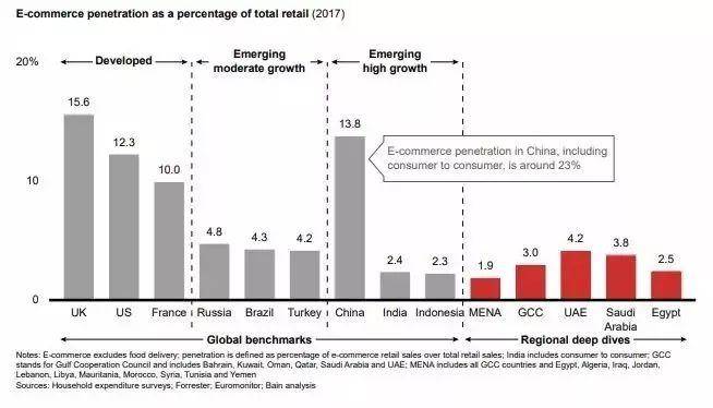 IT研究与顾问咨询公司Gartner的研究指出,2016年中东地区只有15%的企业开设了在线业务,彼时中东居民有90%的在线购物来自外国企业。据公开报道,尽管中东地区是世界上互联网渗透率最高的地区之一,但该地区只有2%的零售业务是在网上进行的。