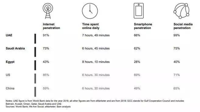 2017年由We Are Social(数字研究公司)和Hootsuite(在线品牌管理服务提供商)共同开展的一项研究指出,阿联酋有着全球最高的社媒渗透率,而沙特阿拉伯则有着全球最高的社媒用户增长率。德勤会计师事务所(Deloitte)在2017年分享了类似的调查结果,该调查显示阿联酋的社媒渗透率高达99%,沙特则实现了73%的同比增长。