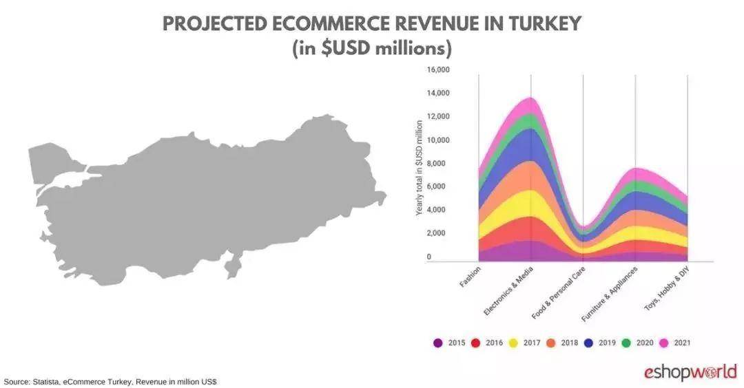 土耳其电商市场中,目前最大的细分市场是电子与媒体类(Electronics & Media)产品,预计2018年单单这一品类的市场规模将达到22.6亿美元。其次是家具和家电类(Furniture & Appliances)市场,预计2018年的市场规模为11.8亿美元。
