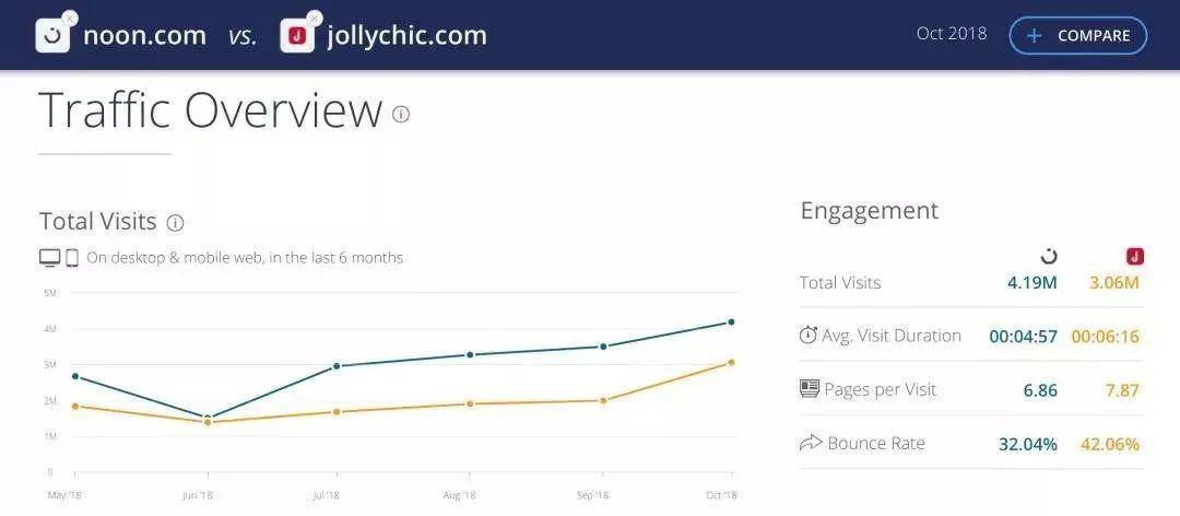 从Similarweb上10月份Noon和Jollychic的沙特流量对比来看,Noon在浏览量上已经达到Jollychic的水平,当然在用户访问时长和单用户浏览页面上Jollychic更有优势。