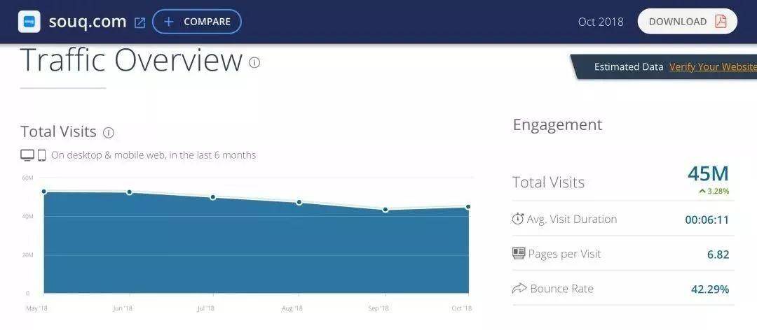 Souq在2018年10月份的月访问量已经达到4500万,单用户访问时长6分钟。自2018年5月开始到10月,Souq的访问量很稳定,可以推断Souq的访问量中自然流量占比非常高。