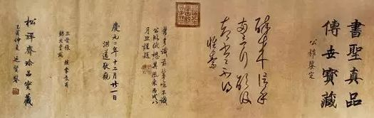 柳公权(778~865)的“鉴定结论”是“书圣真品,传世宝藏”(下图右侧):