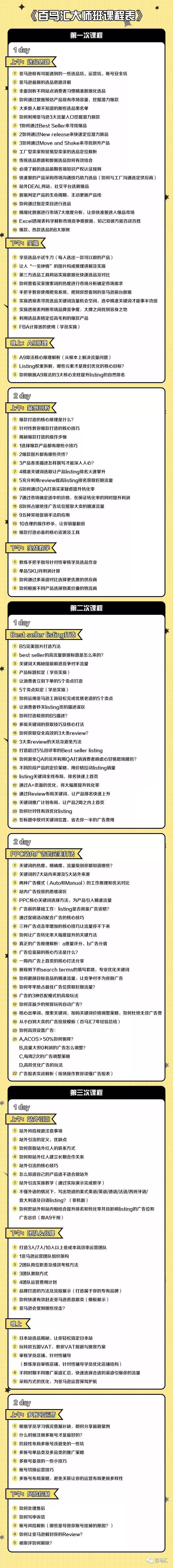 大师班课程由百马汇内部多层次审查最终通过,它基于亚马逊最新政策实时优化更新,更有平均5年实操和培训经验的讲师把关,保证了课程的实用性、易学性;