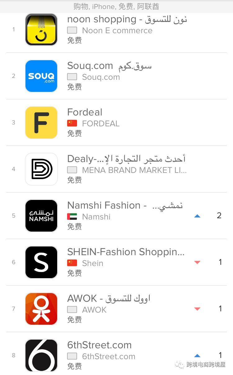 尽管成立还不到2年,Fordeal的发展却非常迅猛。Fordeal在中东多国购物APP下载排行榜中,经常处于前3或者前5名的位置,和它竞争的,有中东本地电商巨头Noon、曾经的中东电商No.1后被亚马逊收购的Souq、中国另外两家深耕中东电商市场多年的Shein和JollyChic。