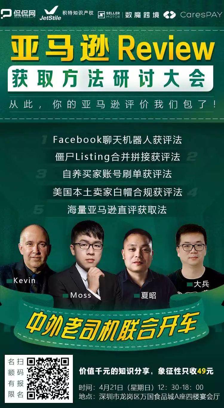 这次研讨会除了我会分享近期关于review获取上面的心得体会以外,我还会邀请我的老朋友:网红大卖家夏昭夏教授,黑科技大神大兵老师这两位跨境老司机来给大家分享关于review获取这方面的干货,关于获取亚马逊评价这一块的黑帽白帽手法,相信跨境行业没有人比他们玩得转。 另外,还有一位重量级嘉宾来自于美国的亚马逊本土大卖Kevin,Kevin自己就是一个本土白人大卖,他的亚马逊创业经历曾经上过“华尔街日报” 和“今日美国” , 同时还是亚马官方全球大会的特约嘉宾。他这次会亲自来到深圳,在研讨会现场从本土卖家的视角,给各位老铁分享美国本土卖家是如何获取亚马逊评价的。
