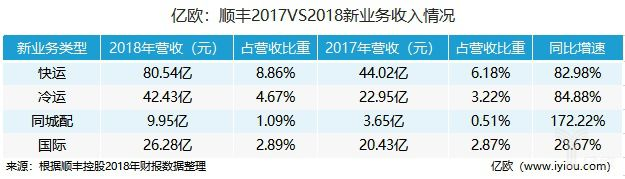 事实上,顺丰如今就已经收获了2B业务的果实。2018年,顺丰的新业务收入达171.89亿元,比上年同比增长了75.93%。占整体营业收入的比重,也由上年的13.71%上升至18.9%。
