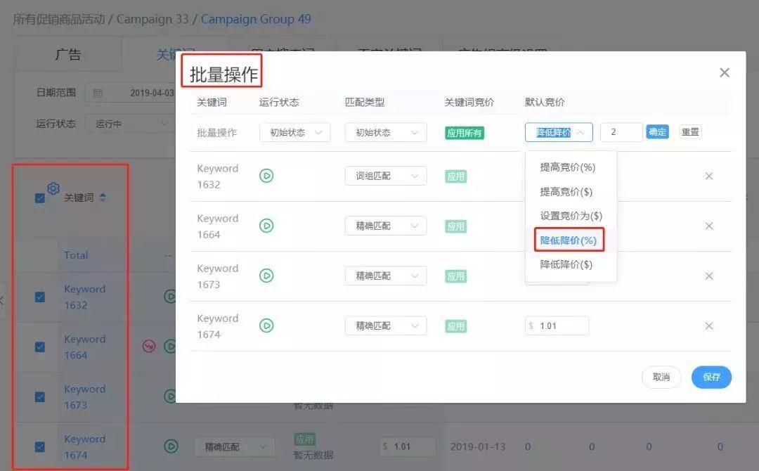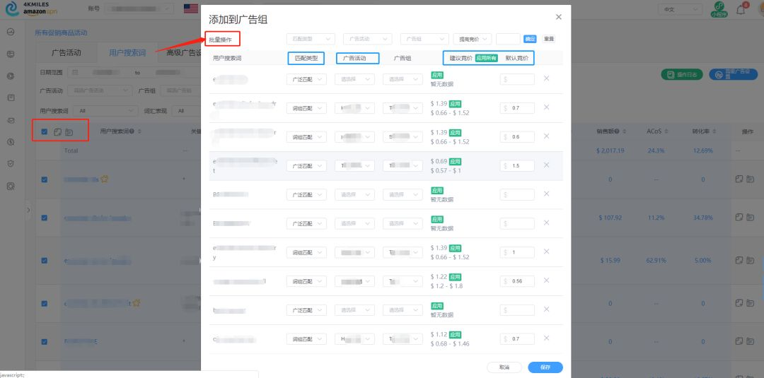 其实做好前期一系列工作,成熟产品的广告活动基本就稳定了,而且积累了一定权重,这个时候控制广告成本,可以尝试在不造成订单量波动的情况下,多次、小幅度降低出价,用4KMILES管理,就可以挑出一批关键词,批量地修改出价,这里调整竞价可以用百分比的方式一点点去调,找到一个出单量稳定又能让ACOS降下来的平衡点。