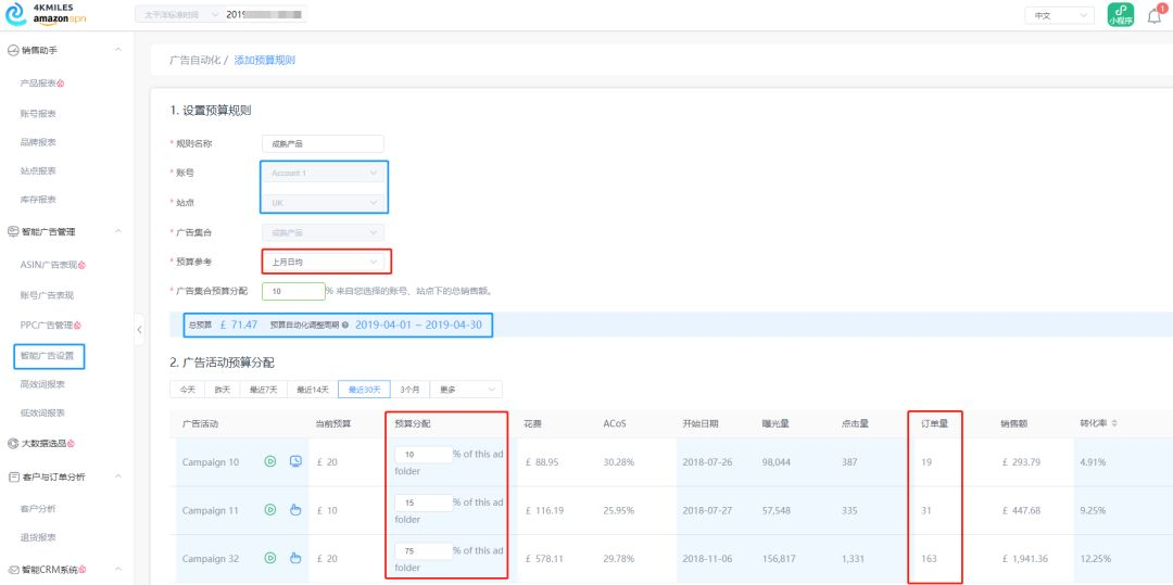 我知道的有些卖家广告预算其实会有花不完的情况,通过4KMILES广告集合去分配预算,可以保证广告花费合理地消耗完,让广告达到预期的效果。