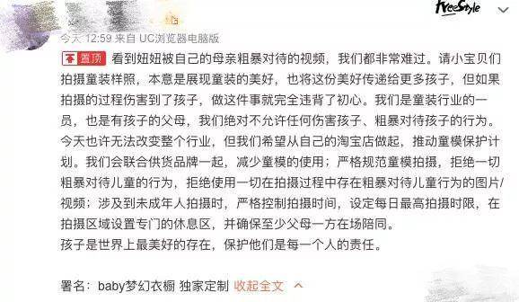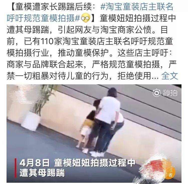 目前,已有110家淘宝店联名呼吁规范童模拍摄行业,推动童模保护。“商家与品牌联合起来,严格规范童模拍摄,严禁一切粗暴对待儿童的行为,拒绝使用一切在拍摄过程中存在损害儿童权益行为的图片、视频。