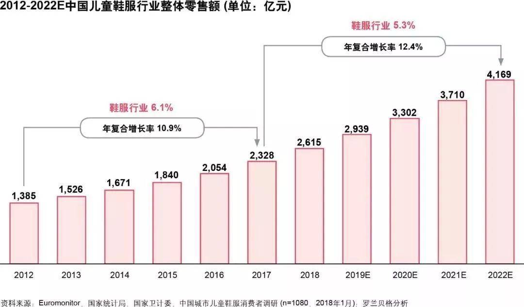 中国儿童鞋服行业整体向好,规模增长加速,未来五年内,增速预计将达到约12.4%,显著高于服装行业平均水平,中国儿童鞋服仍处于成长期,增长潜力巨大。