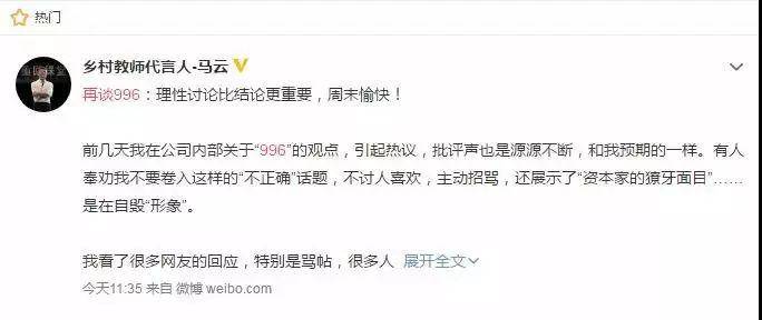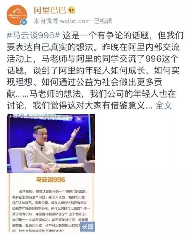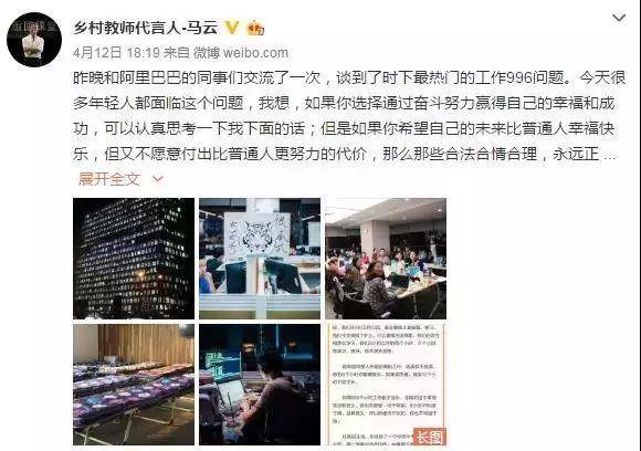 4月11日,马云在阿里巴巴内部交流活动上发表自己对996的看法。他表示,“今天中国BAT(百度、阿里、腾讯)这些公司能够996,我认为是我们这些人修来的福报”, “这个世界上,我们每一个人都希望成功,都希望美好生活,都希望被尊重,我请问大家,你不付出超越别人的努力和时间,你怎么能够实现你想要的成功?”