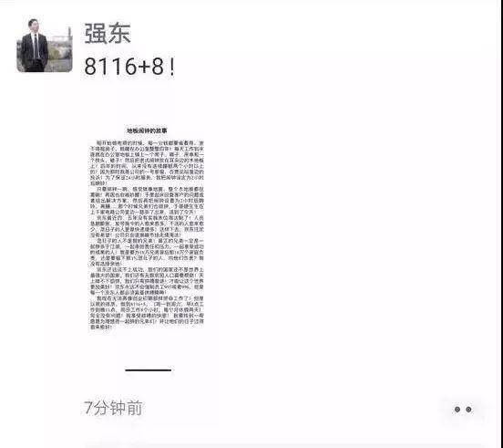 12日,刘强东发朋友圈称,京东不会强制员工995或996,但每一个京东人都必须具备拼搏精神。刘强东自称能做到8116+8,即早八点开始,工作到晚上十一点,一周工作六天,周日工作八小时。他还称,要为18万兄弟背后18万个家庭负责,但混日子的人不是他兄弟。
